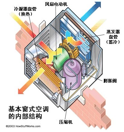 空调中的蒸发循环过程如下: 氟里昂中混有微量用来润滑压缩机的油脂。 窗式空调机组工作原理 窗式空调机组是在很小的空间里安装的一套完整的空调系统。这些空调机组体积很小,可安装在一般的窗框之内。关上机组上的窗户,插入机组,接通电源就可以得到冷气了。窗式空调机组断开电源线后,如果打开它的外壳,可以看到里面有以下部件: 风扇将空气吹过盘管,以此来提高盘管的室外散热和室内制冷能力。