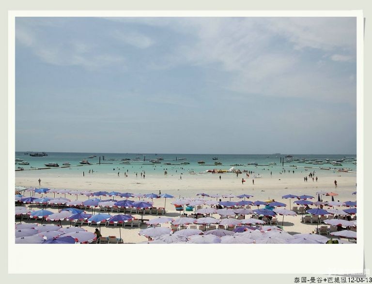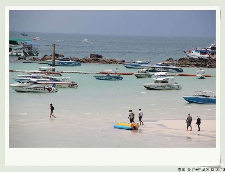 早餐后坐快艇去芭堤雅的最美岛屿金沙岛。首先团员玩了自选自费拖拽伞(700铢/人),我们参加了自费海底慢步(1600铢/人),海水很清透,沙很细软,海底的珊瑚和鱼品种都一般,戴头盔不能低头,没看到脚下的生物(海星、海胆等),但喂鱼真得非常好玩,水下潜水员带我们走到珊瑚丛傍给我们每人一片面包,成群的鱼儿游来啄手中的面包,真的非常有趣,。赠送三项水上活动:独木舟、海中滑板、香蕉船,因已到午餐时间只玩了香蕉船,令人失望的是还不到1分钟摩托艇一个急拐弯,我们就从香蕉船上抛到海水里。结束了水上活动,午餐是金沙岛的海鲜,味道一般。下午2点坐20多分钟快艇回芭堤雅,快艇飞驰在海上好畅快,我喜欢(有些人会晕船幸好时间短忍一下)。碧海蓝天,洁白细软的沙滩真是美呆了。好怀念……还有一位女团员两次“湿身”,第一次拖拽伞好要求不点水,结束点了两次,第二次竟然全身浸入海中,不会游泳的她吓得大哭一场,把我们都笑翻了。金沙岛回芭堤雅快艇停靠离海岸有点远,正好这时下起了太阳雨,大家在海里匆匆往岸上赶,只听到啊一声大叫,她不小心滑倒跌在海水里,这次不光湿身连包包,iphone 4s都全湿。看着狼狈的样子我们又一次笑翻了。去金沙岛的快艇,