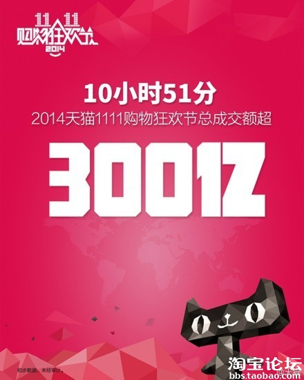 10小时51分,2014天猫1111购物狂欢节总成交额超300亿元!