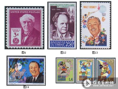 首枚绘有世界动画大师华尔特·迪斯尼形象的邮票,出现在1968年的美国(图l3)。而首套将迪斯尼所创造的动画明星搬上方寸的是,圣马利诺1968-1970年发行一组10枚邮票(选用4枚,图14、15)。