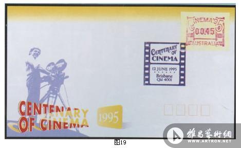 电影专题邮票中,第一枚电子邮票和第一个使用35毫米胶片同等大小的邮戳是,澳大利亚为纪念世界电影百年而发行的(图19)。
